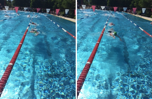 10 Minuten vor meinem eigenen Start habe ich mich dann nach längerem Aufenthalt in der Sonne und entsprechendem Aufwärmen von meinen Vereinskollegen verabschiedet, die erst 30min bzw. 60min nach mir in der Liga starteten. Es war definitiv das Temperieren im Einschwimmbecken notwendig. Dort konnte ich mich aber doch relativ gut an die Temperatur gewöhnen.